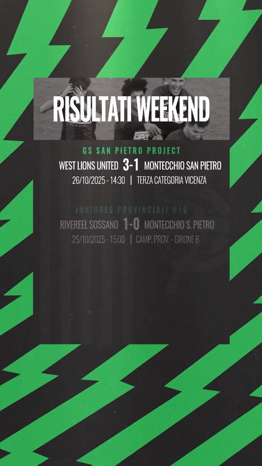 #GIOVANILI\u26a1\n\u23ec Sconfitta esterna per il #gsproject contro i West Lions: un match complicato che non compromette il percorso di crescita\ud83e\udd28\n\u23ec Giornata storta anche per gli #juniores che cadono di misura sul campo del Rivereel Sossano dopo una gara tirata fino all\u2019ultimo \ud83d\ude24\n\ud83d\udd25 Grandissima prestazione degli #allievi che espugnano Poiana con un netto 0-3: solidi, concreti e determinati! \ud83d\udcaa\n\u23ec Giornata amara al Giuriato per i #giovanissimi che si vedono superati di misura dal Longare in una partita equilibrata \u2694\ufe0f\n\nSempre #orgogliosiefieri \ud83d\udc9a\ud83d\udda4\n\n#neroverdi #gssanpietro #giovanili #calciodilettanti #calciovicentino”,”delight_ranges”:[],”image_ranges”:[],”inline_style_ranges”:[],”aggregated_ranges”:[],”ranges”:[{“entity”:{“__typename”:”Hashtag”,”__isEntity”:”Hashtag”,”url”:”https:\/\/www.facebook.com\/hashtag\/giovanili?__eep__=6″,”mobileUrl”:”https:\/\/m.facebook.com\/hashtag\/giovanili”,”__isNode”:”Hashtag”,”id”:”488090857920858#GIOVANILI⚡ ⏬ Sconfitta esterna per il #gsproject contro i West Lions: un match complicato che non compromette il percorso di crescita🤨 ⏬ Giornata storta anche per gli #juniores che cadono di misura sul campo del Rivereel Sossano dopo una gara tirata fino all’ultimo 😤 🔥 Grandissima prestazione degli #allievi che espugnano Poiana con un netto 0-3: solidi, concreti e determinati! 💪 ⏬ Giornata amara al Giuriato per i #giovanissimi che si vedono superati di misura dal Longare in una partita equilibrata ⚔️Sempre #orgogliosiefieri 💚🖤#neroverdi #gssanpietro #giovanili #calciodilettanti