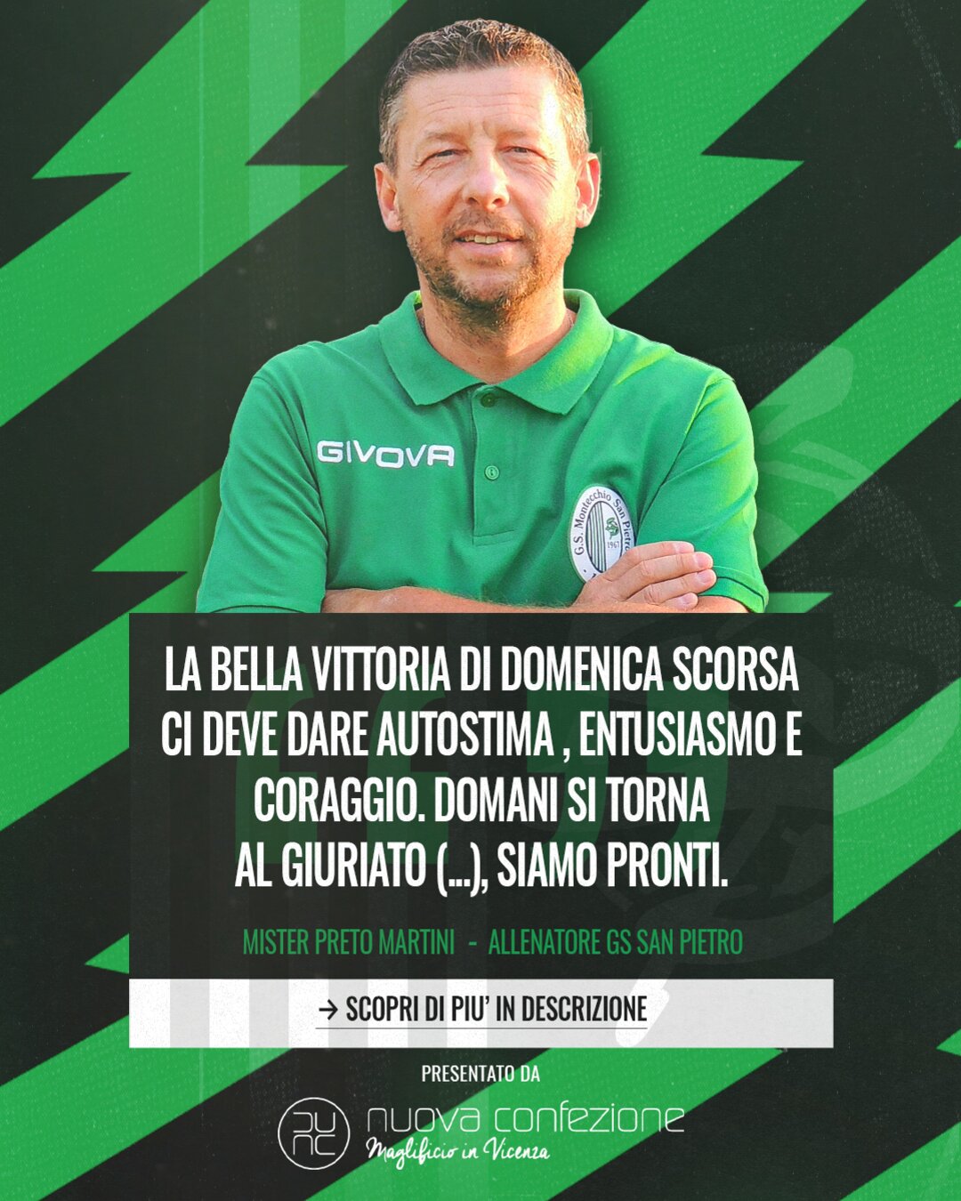 Mister Preto Martini suona la carica in vista del ritorno tra le mura amiche: “Domani si torna al Giuriato dopo la bella vittoria di domenica scorsa, una vittoria che deve darci autostima, entusiasmo e coraggio. Sappiamo di affrontare una squadra ostica, alla ricerca di punti, ma ci siamo preparati bene e siamo pronti per questa sfida.”Sempre #orgogliosiefieri ⚫️🟢 #primacategoria #neroverdi #gssanpietro #calciovicentino