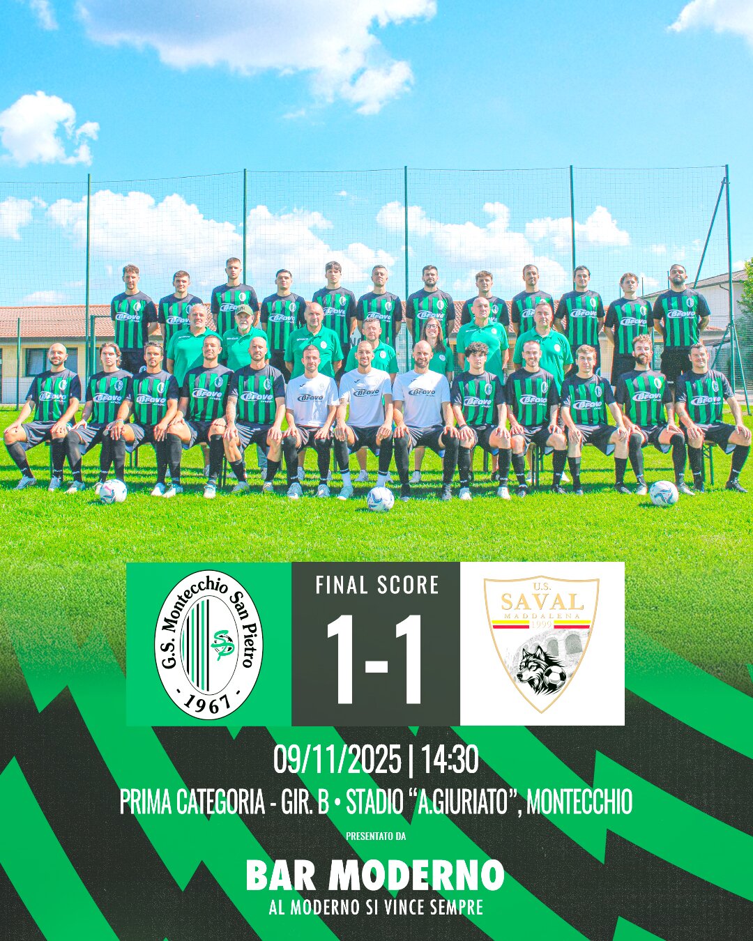 Pareggio al Giuriato per i #neroverdi, che chiudono sull’1-1 contro il Saval Maddalena ⚽️ Una gara equilibrata e combattuta, dove la squadra ha dimostrato continuità e solidità, tenendo in movimento la classifica e proseguendo nel percorso di crescita intrapreso con mister De Forni 💪Ogni punto conta, ogni partita costruisce fiducia: avanti così, con determinazione e spirito di gruppo🔥Sempre #orgogliosiefieri⚫️🟢 #primacategoria #neroverdi #gssanpietro #calciovicentino