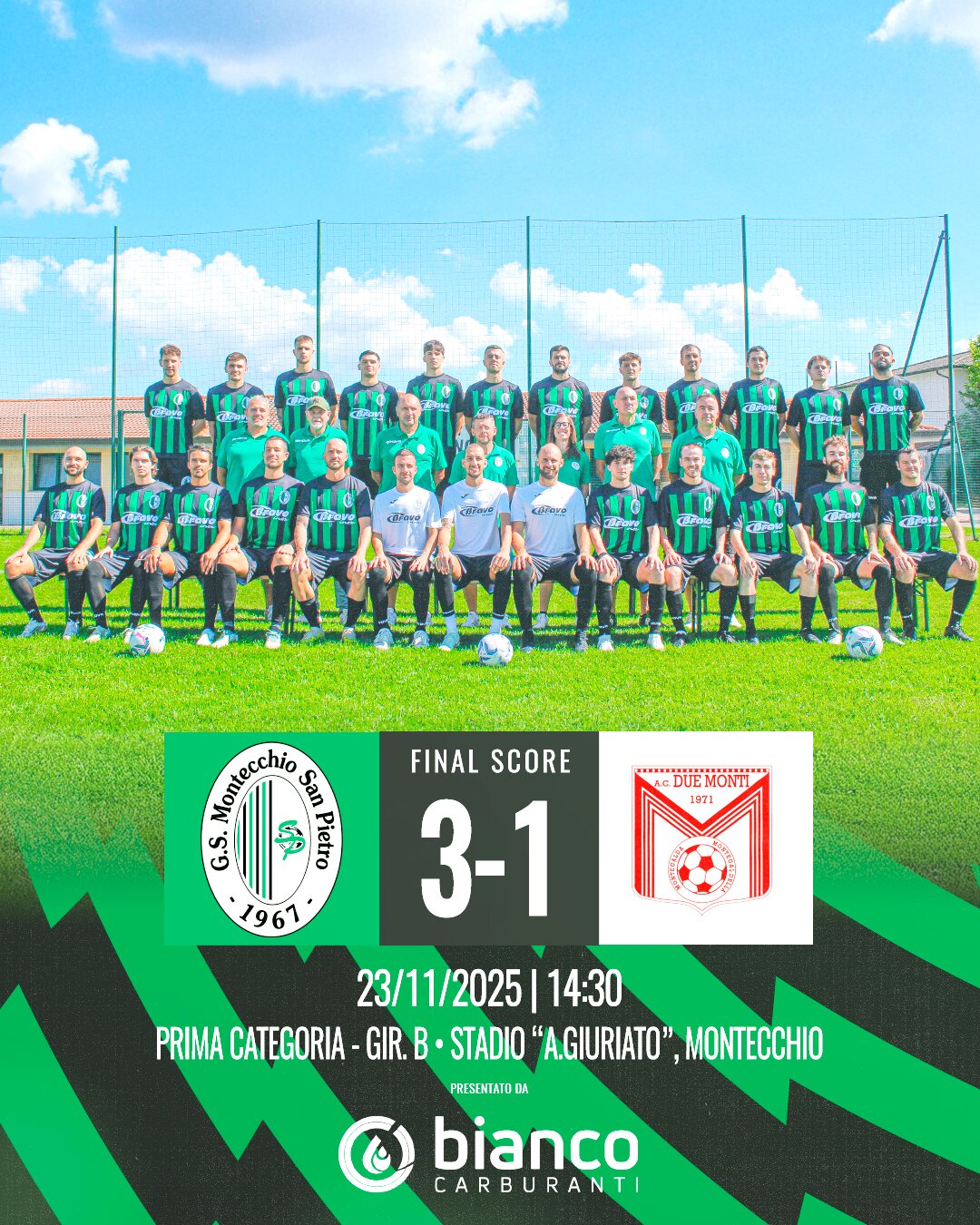 Vittoria pesante al “Giuriato” per i #neroverdi, che superano il Due Monti con un convincente 3-1 e centrano la seconda vittoria consecutiva, allungando a quattro la serie di risultati utili di fila💪 A segno Visonà, Peruffo e Chiarello, ma tutti protagonisti di una prestazione solida e continua per quasi tutti i 90 minuti🔥🏃♂️ Un successo meritato e accompagnato da un bel salto in classifica, frutto del lavoro, dell’intensità e della fiducia che la squadra sta costruendo giornata dopo giornata dopo un inizio difficile. La strada è quella giusta: avanti così, ragazzi 🔥 #forzasanpietro #primacategoria #calciovicentino